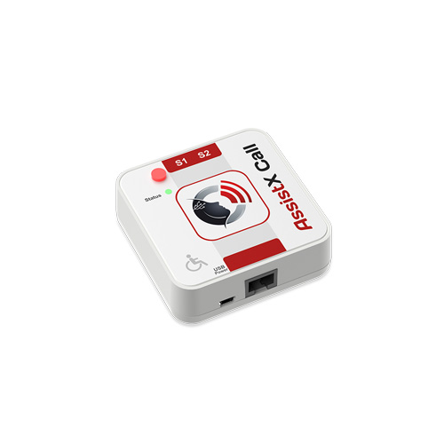 AssistX Call ist ein Sensoradapter für Lichtrufanlagen und ermöglicht eine Rufauslösung unter Verwendung von speziellen Sensoren (Rufauslöser), die nicht direkt an die Rufanlage angeschlossen werden können. AssistX Call ist mit 2 AssistX Ports ausgestattet. Diese können mit 2 beliebigen Einfachsensoren oder -taster bzw. AssistX Port kompatiblen Sensoren verbunden werden.